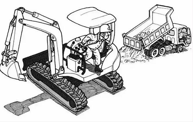 正在进行用液压挖掘机将装在翻斗车里的砂土刮平的作业。听到翻斗车驾驶员的呼唤后,液压挖掘机的机手停止作业,正要从液压挖掘机上下来。